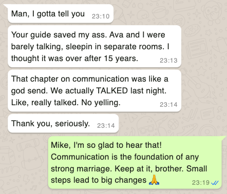 My wife told me she 'wasn't in love with me anymore' and wanted a separation. I was devastated. I stumbled across this guide and the 'reigniting her love' chapter spoke directly to my situation. I realized I'd been neglecting her emotional needs for years. The '5 love language mastery strategies' opened my eyes - Her primary love language was acts of service, and I'd been trying to show love through telling her. I started doing little things around the house without being asked, surprising her with her favorite coffee in the morning, and planning date nights. Last night, she cuddled up to me on the couch - something she hasn't done in months - and whispered 'I feel so much closer to you recently and I don't know why, but I don't want it to change.' I honestly teared up. This guide didn't just save my marriage, it's helping me become a better man and husband.