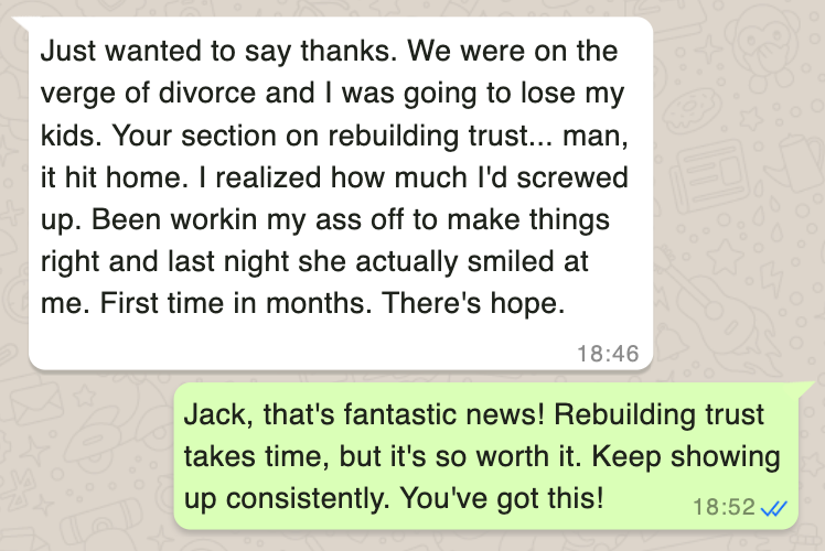 After years of research, personal experience, and working with countless couples, I've developed proven strategies that will help you win back your wife's respect, reignite her love, and keep your family together.